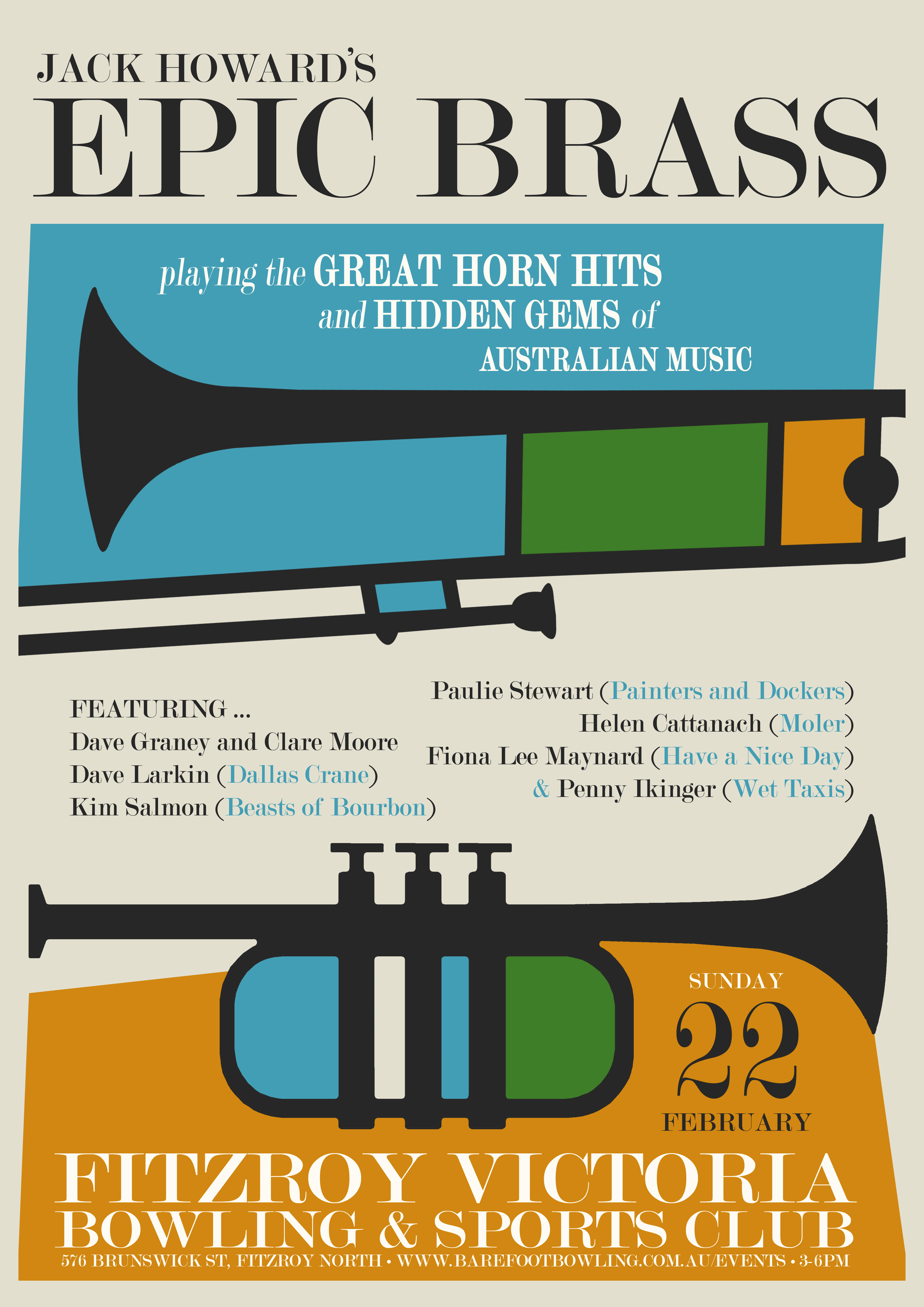 In breaking news, Jack Howard’s Epic Brass cavalcade will be joined by the wonderful Dave Graney AND Clare Moore, the sensational Kim Salmon (Beasts Of Bourbon, The Scientists) and one of Australia’s great rock vocalists, Dave Larkin from Dallas Crane at their upcoming Memo show on Sunday Feb 22nd. They’ll join the regular EB legends – Paulie Stewart (Painter and Dockers), Fiona Lee Maynard and Helen Cattanach from Moler, alongside the incredible EB band and horn section – with new songs and new takes on “the great horn hits and hidden gems of Australian music.” Better be there.