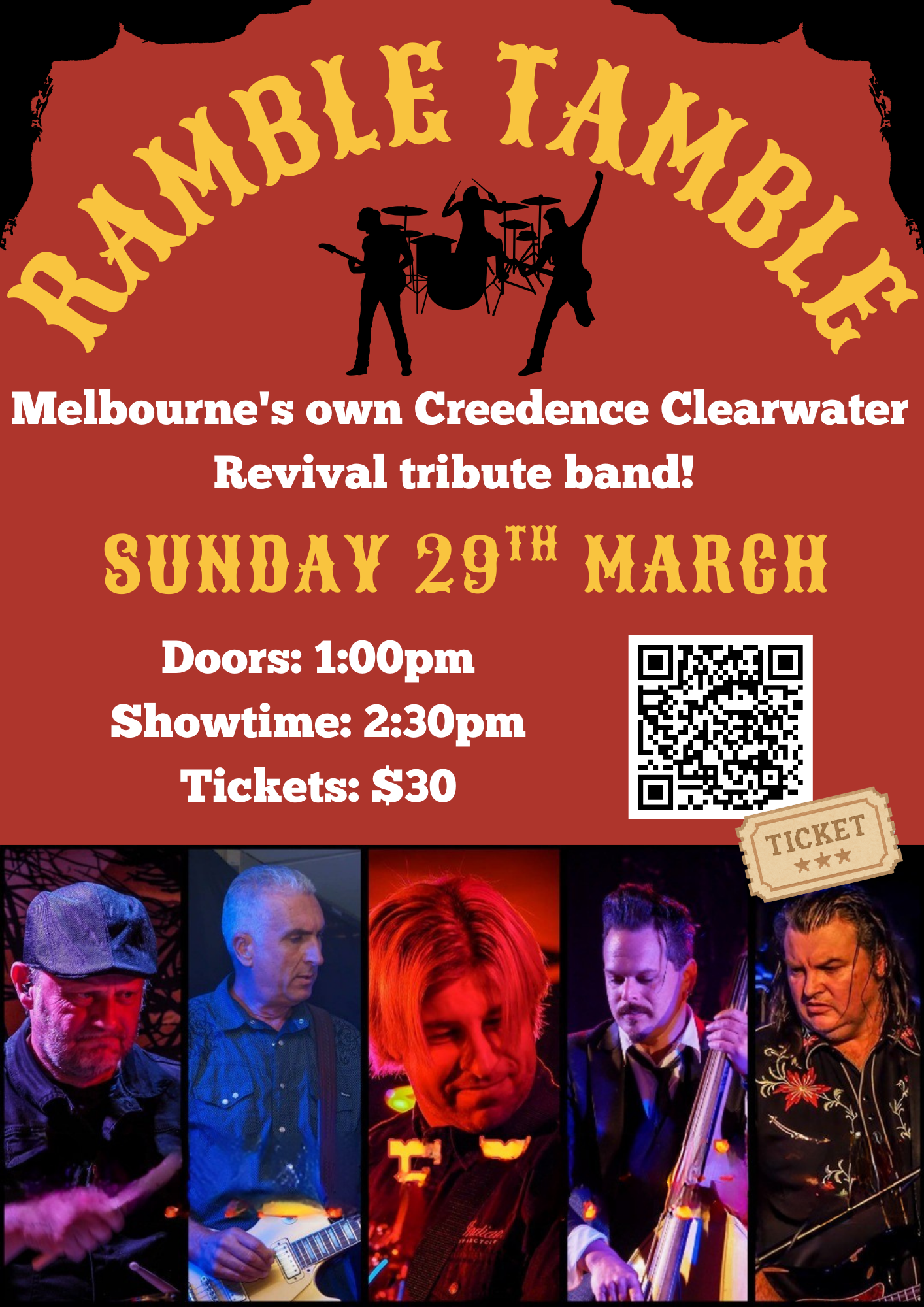 Ramble Tamble are a world class five-piece Creedence Clearwater Revival tribute band based in Melbourne. The band was conceived in 1989. All band members have had years of experience touring in some of the world's top recording artists nationally and internationally respectively. They take immense pride in the detail they put into producing this CCR show. It's a Creedence tribute that no die-hard Creedence fan would be disappointed with.